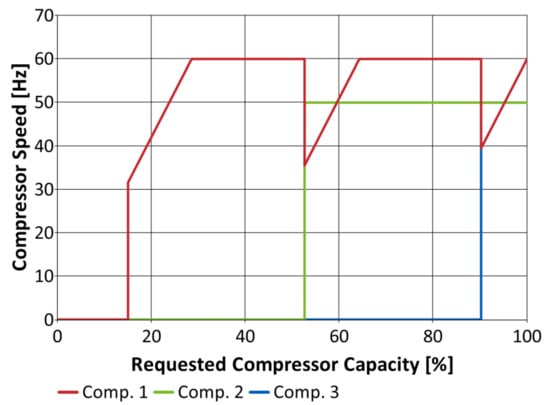 As for the compressor blocks, the compressors with the smallest capacity are always frequency-controlled in the range 30 to 60 Hz. The remaining compressors are on/off-controlled, which involves the control strategy following a sawtooth-shaped adjustment for the overall capacity, as shown in Figure 4. The controller of each compressor group uses the same value as the setpoint as that implemented in the real system. The MT compressor capacity is adjusted to match the MT evaporation temperature setpoint at −9 °C (or −4 °C with flooded evaporation). In the case of LT compressors, the LT evaporation setpoint is at −31 °C (the system was operated 1 K lower than the dimensioning value in Table 2). The AUX compressor capacity aims to control the receiver pressure according to the setpoint, which in the base case is 35 bar. However, the flash gas bypass valve (FGBV) is used when the amount of flash gas in the receiver is insufficient considering the compressors implemented.