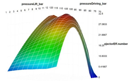Ejector modelling can be approached with different levels of complexity. The TIL libraries utilized in the Modelica models contain ejector models of relative simplicity. Among these options is the constant-efficiency-based model, where a nozzle model and constant ejector efficiency value need to be defined. The nozzle model relates the mass flow rate of primary flow with the cross-section area of the flow-restricting channel (opening degree). The ejector efficiency determines the pressure lift/entrainment ratio of the ejector and has been defined in works in the literature such as [26,27]. More complex and detailed ejector models can be implemented, and an example was a result of the project SuperSmart-Rack [28], funded by the Research Council of Norway. This model is based on extensive sets of measurements including various ejector operation points [29,30,31,32]. The model implemented “.bin” files that contain the sets of measurement data. The model can be used as an ejector block with numerous parallel ejector cartridges operating in an on/off mode to adjust the total ejector nozzle area in a discrete way. In addition to the mere ejector model, sophisticated control blocks are implemented for switching the particular cartridges on and off, dependent on a given optimal high-pressure function. Figure 5 depicts the ejector efficiency map of the utilized ejector model in this study.