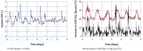 Figure 11 shows the resulting system COP curves and percentage increase in COP due to HP ejector use, for the same week that was presented for the validation (week 34 in 2019). The HP ejector’s ability to transfer load from the MT to AUX compressors means that the FGBV is almost unnecessary in the removal of the flash gas from the receiver and the regulation of its pressure. In the configuration with HPV only, the FGBV is much more present, which has a negative effect on system COP and on the use of the AUX compressors. On average, during the period investigated, the system COP is improved by 5.81% with the HP ejector compared to the ejector-less system with identical boundary conditions (ambient temperatures and loads). The most important benefits occur, as would be expected, when the ambient temperature is higher, in the middle of the day. However, it is worth noting that the summer week taken for validation is mild considering the location of the system, as represented by the gas cooler outlet temperature represented in red in Figure 11 (right). Higher benefits would be expected on warmer days and if the ejector technology was combined with a smart receiver pressure control or a flooded MT evaporator, as investigated in the following subsections.