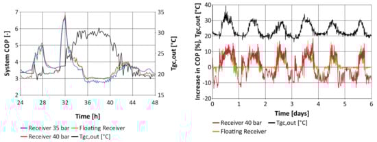 The floating receiver setpoint approach appears to be more convenient for the changing environmental conditions that exist with integrated CO2 refrigeration systems, as shown in Figure 12. It combines the COP enhancement at warmer conditions with no deterioration at colder temperatures and lower AC demands. From the HP ejector with a fixed setpoint at 35 bar to a controlling strategy with a floating receiver pressure, the average system COP increase in the reference week goes from 5.81% to 8.01%, using the HPV layout (ejector-less) as a reference.