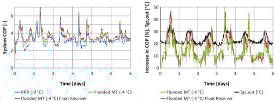 Analysis of the effect of MT flooded evaporation on system performance, both with fixed and floating receiver setpoints. (Left), system COP for HPV system compared to ejector-supported flooded evaporation. (Right), increase in COP during the reference week on the basis of the HPV system layout.