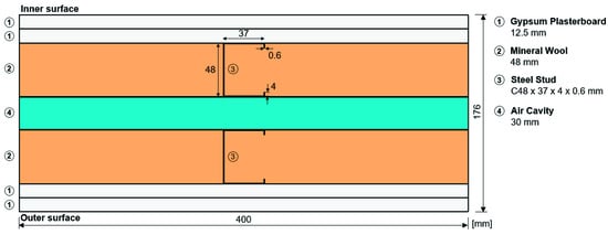 A representative horizontal cross-section of the reference double-pane LSF wall used in the lab tests is displayed in Figure 1. The frame structure of each LSF wall pane is composed of steel studs (C48 × 37 × 4 × 0.6 mm) spaced 400 mm apart and filled with mineral wool (MW) panels with a thickness of 48 mm. The LSF wall panes are separated by a 30 mm thick air cavity and its most superficial layers are made up of two gypsum plasterboards (GPB) panels with a total thickness of 25 mm, on each side.