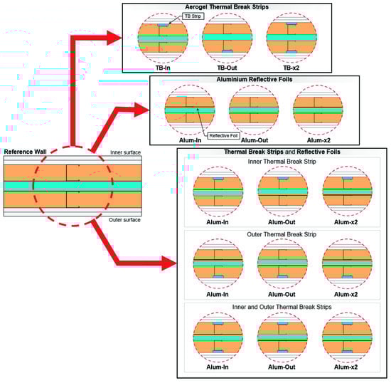Thus, besides the reference LSF wall without any thermal break (TB) strip nor aluminium reflective (AR) foil, additional selections included an LSF wall with one aerogel TB strip, a LSF wall with a single AR foil, and another LSF wall containing two TB strips (inner and outer) as well as double AR foils (inner and outer), embracing in this way the two thermal performance improvement strategies and a combined LSF wall configuration.