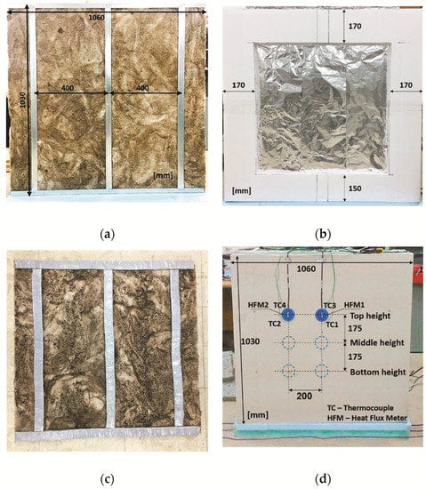 Double-pane LSF wall test sample: (a) LSF wall pane (hot side); (b) EPS frame and reflective foil; (c) aerogel TB strip; (d) arrangement of the monitoring system (cold side).