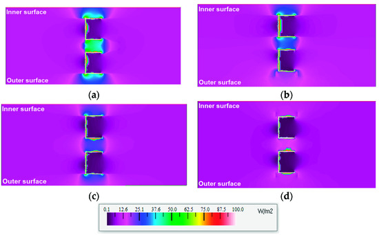 Predicted heat flux distribution within the LSF walls’ cross-section: (a) reference LSF wall; (b) outer TB strip; (c) outer AR foil; (d) double TB strips and AR foils.