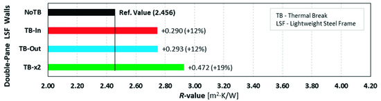 Comparing these values with the previous ones for the TB strips (Table 4), it can be concluded that the thermal performance improvement due to aluminium reflective (AR) foils is more effective, allowing to achieve higher thermal resistances of the double-pane LSF wall. In fact, the -value improvement due to a single AR foil (inner or outer) is similar to the -value improvement provided by two aerogel TB strips (+19%).