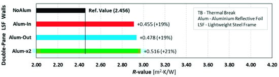 The use of two AR foils, instead of a single one, only improved the thermal resistance by an additional 5%, i.e., +55% (+1.352 m2·°C/W) in relation to the reference LSF wall. The synergy effect remains, being even higher since this value (+55%) is considerably bigger than the summation (+40%) of individual improvement contribution from two TB strips (+19%, Table 4) and from two AR foils (+21%, Table 5). The -value increase measured for double TB strips combined with double AR foils (about +1.35 m2·°C/W) is similar to the one achieved by adding 47 mm of continuous mineral wool (MW).