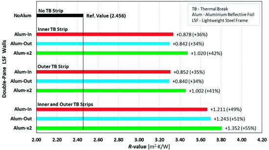 Looking to the LSF walls with inner or outer TB strip, having two AR foils (inner and outer), the -value increase is around +1.01 m2·K/W (+41%). Again, this thermal resistance improvement (+41%) is higher than the summation of individual -values increase (+33%), obtained from Table 4 (+12%) and Table 5 (+21%), evidencing a bigger synergy outcome between the TB strips and the AR foils.