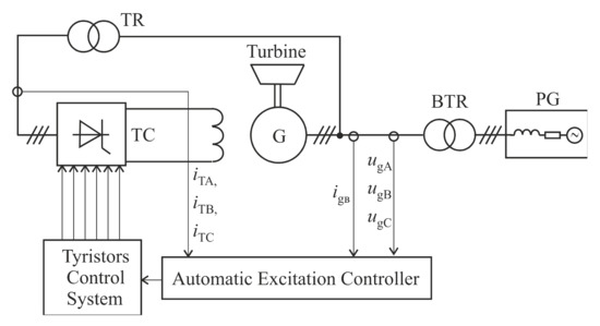 Static excitation system of synchronous generators: G—synchronous generators; BTR—generator’s transformer; PG—power grid; TR—input transformer of excitation system; TC—thyristor converter.