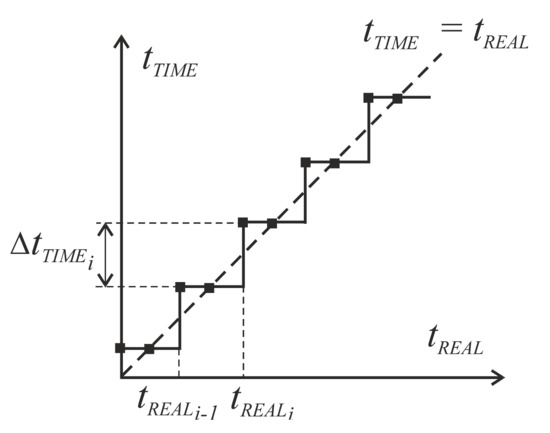 The real time must be measured in order to synchronize it with the calculated time of the model. The internal PC timer can be used for this purpose using the QueryPerformanceCounter C-function. The error caused by time measuring discretization must be eliminated in order to determine the real time at any moment. To do this, the timer reading tTIME was approximated using the least-squares method. Approximating the dependence was determined according to the equation tTIME = atREAL, where a must equal 1 (the dotted line in Figure 4).