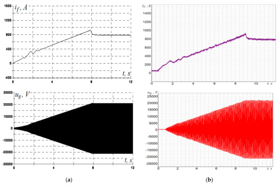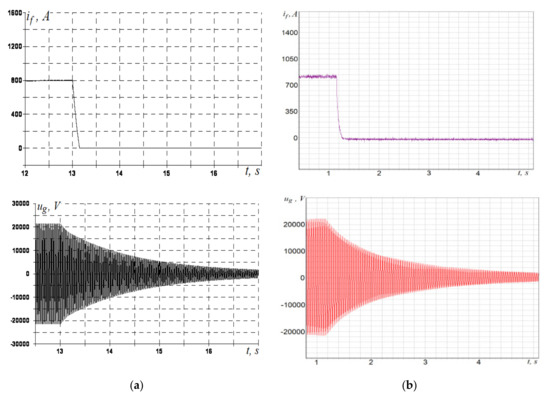 (a) Simulation in the hybrid system; (b) experimental results of the field current (if) and terminal voltage of the generator (ug, instantaneous value) for the de-excitation of the generator.