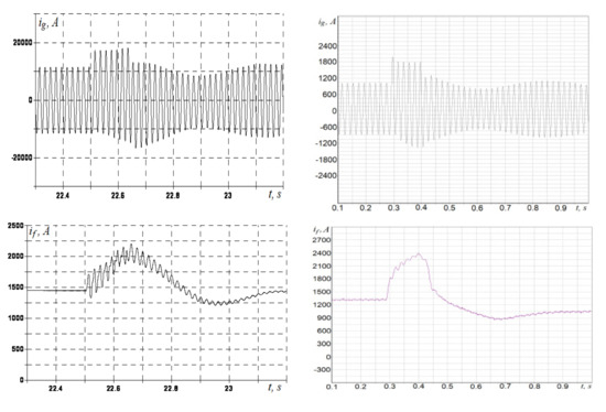 A comparison of the results obtained in the created hybrid system and the experimental results is shown in Figure 5 for the initial excitation operating mode, in Figure 6 for the de-excitation operating mode, and in Figure 7 for the short circuit in power line. The results of this comparison confirm the adequacy of the models developed and approach proposed.