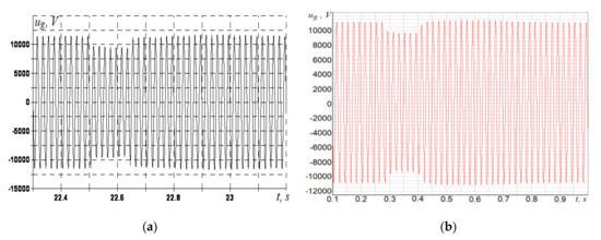 Mathematical models of the other elements-multipoles (transformer, power grid, thyristor converter) are presented in the form of Equation (8). They are combined into a single system using equations compiled according to Kirchhoff’s first law for the system’s nodes, in which the elements’ outer branches are connected. The method for connecting the elements is described using incidence matrices. The calculation algorithm is described in [15].