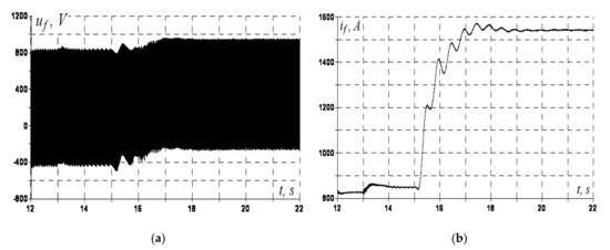 The sharply changing active power loading occurred at 15 s and was achieved by increasing the active power supplied to the generator by the turbine. In this case, there was current pulsation as the current increased to a nominal value (Figure 8a). Th excitation controller with the PI voltage controller in the diagnosed excitation system provided insignificant dynamic error (1.8%) when the active power changed sharply. The static error of voltage regulation is absent (Figure 8b).