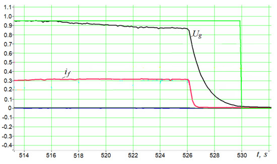 The oscillogram of the frequency decrease when the synchronous generator was not loaded is shown in Figure 10. The frequency decrease was achieved by reducing the turbine speed. The excitation controller provided the stabilization of the magnetic flux for the prevention of the magnetic circuit saturation. The protection system disabled the generator excitation when the frequency was reduced to a critical value (about 45 Hz). There was a de-excitation of the synchronous generator. The field current was reduced to zero within 0.8 s due to the thyristor converter being switched to inverter mode. The time to terminal-voltage reduction (de-excitation time) was 4.0 s, as the magnetic flux was maintained by the damper system of the generator.