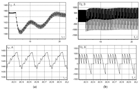 (a) Field voltage (uf); (b) field current of the generator (if) in the case of a thyristor fault (i.e., when the thyristor does not turn on).