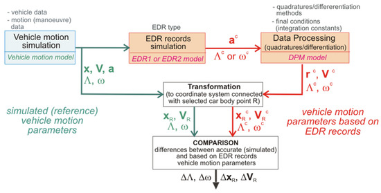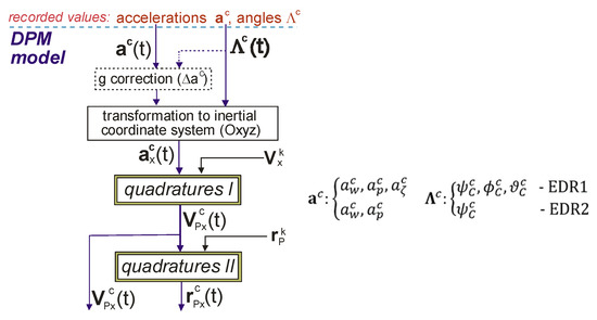 The reconstruction of motion consists of appropriate (for the specific recorder configuration, e.g., EDR1 or EDR2) processing of the recorder’s output signals. A schematic diagram of the data processing procedure has been shown in Figure 7. The procedure is based on the integration of acceleration records transformed to the inertial system attached to the road. The numerical integration ([46,47]) is carried out from a definite final instant corresponding to a known vehicle position and velocity (e.g., post-accident vehicle position specified by witnesses). If possible, transducer readings are adjusted by adding the values of gravitational acceleration components (Δac = −gc, see Equation (7)). The results of successive quadrature operations define, as appropriate, the velocities and positions of point P of fixing the EDR, expressed in the inertial system Oxyz. Afterwards, they can be transformed in order to obtain time histories of the velocities and trajectories of any point in the vehicle body.