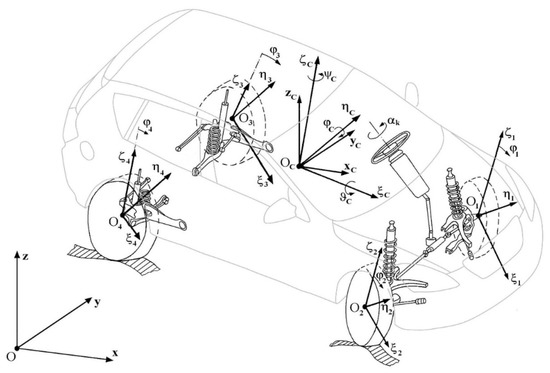 - moving coordinate systems fixed to the rigid bodies of the model, i.e., body solid (OCξCηCζC) and four road wheels (O1ξ1η1ζ1, O2ξ2η2ζ2, O3ξ3η3ζ3, O4ξ4η4ζ4);