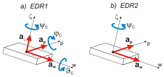 The EDR design solutions that can be met in reality differ from each other in the number of the recorded components of the vectors that define the vehicle position. In these terms, two characteristic EDR types have been distinguished (Figure 3). The devices of the first type (denoted herein by EDR1) are similar (within the scope as considered here) to flight recorders: they record three acceleration components, i.e., longitudinal one aw, lateral one ap, and “vertical” one aζ, and three angles, i.e., yaw angle ψC, pitch angle φC, and roll angle ϑC, or the corresponding angular velocities. The devices of the second type (denoted herein by EDR2) can be frequently met in motor vehicles and are a simplified version in comparison with the aircraft solution. The vehicle motion is treated as a two-dimensional one, with the parameters recorded being two acceleration components, i.e., longitudinal one aw and lateral one ap, and one angle, i.e., yaw angle ψC, or its time derivative, i.e., yaw velocity.