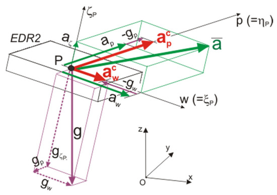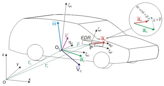 Vectors aPc and gc represent the acceleration of point P and gravitational acceleration, expressed in the reference system PξPηPζP (in the OCξCηCζC system attached to the vehicle, the same acceleration vectors are denoted by aP and gξ, respectively). The acceleration sensors’ readings have been graphically illustrated in Figure 6 (where the EDR2 unit has been used as an example for simplification).