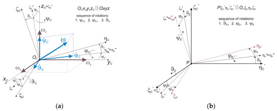 Angular situation of the coordinate systems: (a) OCξCηCζC in relation to Oxyz; (b) PξPηPζP in relation to OCξCηCζC.