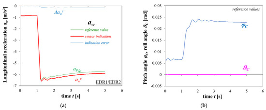 Figure 8 and Figure 9 show the analysis results obtained for the case of braking the vehicle from an initial speed of 90 km/h with a deceleration of about 6 m/s2 (this is approximately equal to the absolute value of the longitudinal acceleration of the centre of the vehicle mass). The vehicle braking was caused by applying a force to the brake pedal, where the driver reaction time and the reaction of braking system components were reflected in the time history of the brake pedal force. Figure 8a shows the actual (simulated, considered as “accurate”) value of longitudinal acceleration aPξ and the value recorded by the EDR (awc). The difference between them (denoted by φawc) resulted from variations in the pitch angle ϕ1 (see Figure 8b).