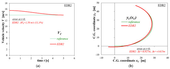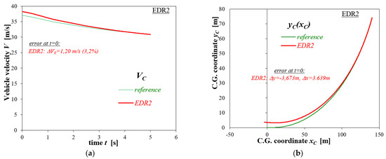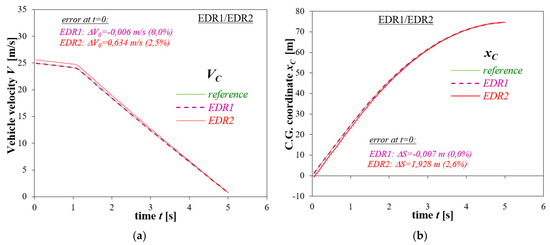 Figure 9 shows the reconstruction results obtained by using recorders of both types (EDR1 and EDR2). The time histories of vehicle velocity and position were reconstructed “backwards”, i.e., from the known final vehicle position and velocity to the initial instant of the simulation of the vehicle motion. The data presented in Figure 9a,b concern vehicle velocity and position, respectively. The differences that can be seen at the beginning of the velocity and position curves illustrate the reconstruction errors, i.e., errors of determining the initial velocity (ΔV0) and distance travelled (ΔS).