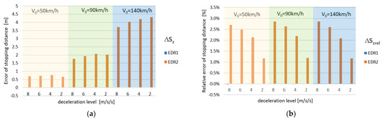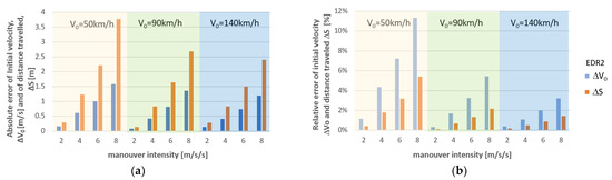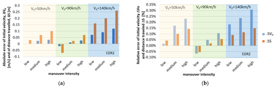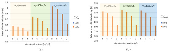 Analysis results were obtained for more cases, differing from each other in the pre-set initial vehicle velocity (50, 90, and 140 km/h) and braking intensity (deceleration level of about 2, 4, 6, and 8 m/s2) have been summarised in Table 1. Additionally, the errors in estimating the initial velocity and stopping distance of the vehicle have been directly shown in the absolute and relative form in Figure 10 and Figure 11.
