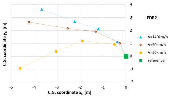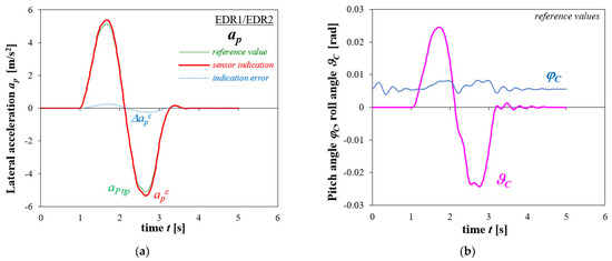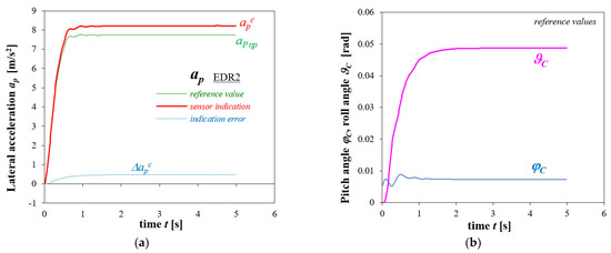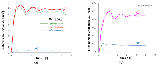 Both EDR types mentioned in Section 2.2 were taken into consideration: EDR1 (6 parameters of the motion) and EDR2 (3 parameters of the motion). For the analysis, an option was adopted where angles (instead of angular velocities) were used to define the angular position of the vehicle body solid. Moreover, to avoid the introduction of additional disturbing factors that might affect the calculation results, an assumption was made that the EDR sensors were placed at the centre of vehicle mass (see Figure 4, P = OC) and the motion of the centre of the vehicle mass was analysed (see Figure 1, R = P = OC). In addition to the above, an assumption was also made that the sensors had been calibrated for the vehicle standing on a horizontal road and loaded as in the tests. The frequency of recording the parameters under analysis was assumed as 20 Hz.