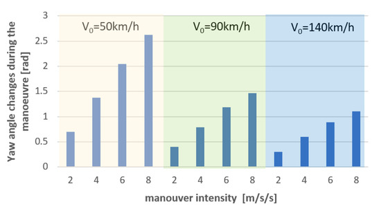 The last regularity that can be noticed is a decrease in error values with increasing vehicle velocity, which distinguishes this manoeuvre from a similar case (in terms of absence of reversal of the acceleration sign), i.e., from the straight-line braking. To explain this finding, it is worth noticing that, apart from the initial phase of the manoeuvre, the vehicle motion under analysis is similar to the steady-state motion along a circle. Therefore, it is worth paying attention to another variable that characterises the vehicle motion, i.e., the yaw angle. Figure 21 presents the data collected that show the “angular distance” travelled by the vehicle in every case. When comparing the data plotted in this graph with the reconstruction errors presented previously in Figure 19, their qualitative convergence can be noticed: the higher the velocity, the smaller the change in the yaw angle in the manoeuvre under consideration. Based on the said qualitative convergence, a hypothesis may be formulated that the value of errors, especially the errors of the vehicle trajectory, are affected by the “angular distance” travelled by the vehicle. This aspect will be presented in broader terms in the next example, where the steady-state circular motion will be analysed.