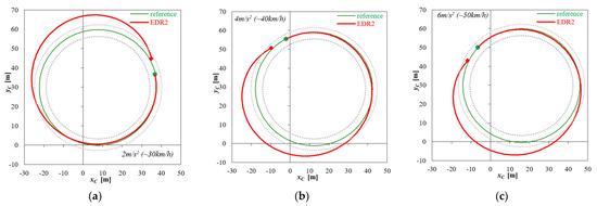 Driving in a roundabout, R = 30 m. Reconstruction of vehicle body C.G. trajectory based on EDR2 records. Lateral acceleration level: (a) 2 m/s2; (b) 4 m/s2; (c) 6 m/s2. “●”—start of the reconstruction (end of the motion under analysis); “♦”—end of the reconstruction (reconstructed initial position); grey dotted lines represent edges of the roundabout carriageway 6 m wide.