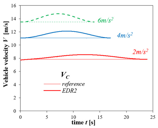 Driving in a roundabout, R = 30 m. Reconstruction of vehicle C.G. speed based on EDR2 records for three lateral acceleration levels: 2 m/s2; 4 m/s2; 6 m/s2.