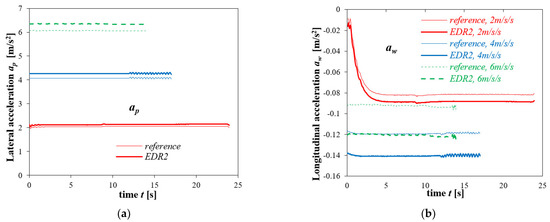Noteworthy is also the fact that the reconstruction errors are also affected by the error in estimating the longitudinal acceleration (Figure 24b). In the example presented, this can be seen, e.g., in Figure 25b and Figure 26a, when the cases with 4 m/s2 and 6 m/s2 are compared with each other. For the manoeuvre with 6 m/s2, the longitudinal acceleration level, in terms of its absolute value, is lower than that for the manoeuvre with 4 m/s2 (see Figure 24b). This has contributed to the fact that in spite of a higher level of lateral acceleration, the errors in estimating the distance travelled are here somewhat lower (see Figure 25b). Similarly, the radius of the reconstructed trajectory is also somewhat smaller (see Figure 26a).