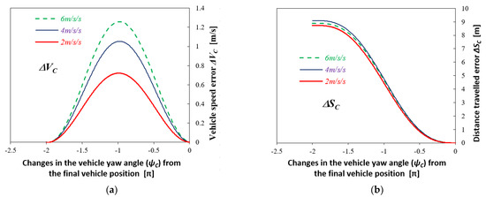 Driving in a roundabout, R = 30 m. Errors of: (a) vehicle body C.G. speed; (b) vehicle body C.G. distance travelled as a function of changes in the vehicle yaw angle (zero—vehicle final position, −2π—vehicle initial position).