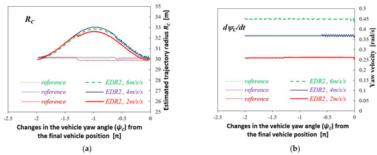 It can be seen that on the interval from zero to −π, the speed reconstruction error is increasing; in consequence, the rate of growth in the error of estimating the distance travelled is increasing as well. On the interval where the vehicle has already “turned back”, i.e., from −π to −2π, the speed reconstruction error is decreasing to values close to zero; the distance error is still increasing, but the growth rate is decreasing. Since the vehicle yaw velocity is approximately constant (Figure 26b), the changes in the reconstructed vehicle speed value translate into changes in the reconstructed trajectory radius value (Figure 26a), i.e., growth in the radius on the yaw angle range from 0 to −π and decline on the range from −π to −2π.