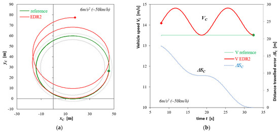 Driving in a roundabout, R = 30 m. Lateral acceleration level 6 m/s2 (vehicle speed ca. 50 km/h). Reconstruction based on EDR2 records of: (a) vehicle body C.G. trajectory; (b) vehicle body C.G. speed and error of the distance travelled. “●”—start of the reconstruction (end of the motion under analysis); “♦”—end of the reconstruction (reconstructed initial position); grey dotted lines represent edges of the roundabout carriageway 6 m wide.