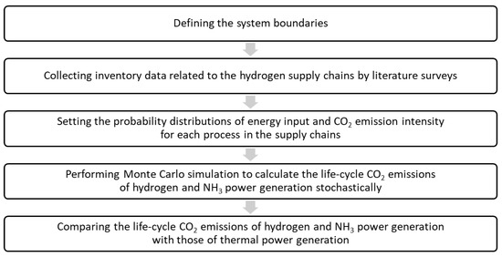 Figure 1 illustrates the research methodology of this study. Firstly, the system boundaries are defined to determine which unit processes to be included in this study. Secondly, inventory data related to the operation of the hydrogen supply chains are collected by literature survey. This study focuses on the life-cycle CO2 emissions due to the operation of the supply chains and the emissions for capital goods are out of scope. Thirdly, based on the collected data, the probability distributions of energy input and CO2 emission intensity are set for each process in the supply chains. Fourthly, according to the given probability distributions, Monte Carlo simulations are performed to calculate the life-cycle CO2 emissions of hydrogen and NH3 power generation stochastically. Finally, the calculated life-cycle CO2 emissions are compared with those of thermal power generation to discuss the environmental benefits of hydrogen energy for power generation.