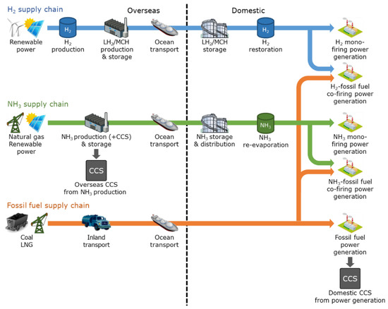 Evaluation of hydrogen technologies is also important for establishing a low-carbon hydrogen society. The world’s first ministerial-level meeting on realizing a hydrogen society, termed the Hydrogen Energy Ministerial Meeting, was held in Tokyo on 23 October 2018. The Chair’s summary of the meeting, known as the Tokyo Statement [12] stresses the importance of investigating and evaluating the potential of hydrogen to reduce CO2 and other pollutants in realizing a hydrogen society. As mentioned above, hydrogen does not emit CO2 during the utilization phase; however, CO2 emissions are generated by the resource and utility inputs (electricity, fuel, water, etc.) during the production, storage, and transportation stages of hydrogen and energy carriers. Therefore, to demonstrate the environmental superiority of hydrogen energy, it is necessary to evaluate the emissions of the entire supply chain through a life-cycle inventory (LCI) analysis. LCI analysis for hydrogen supply chains has been conducted in many studies on the well-to-tank greenhouse gas (GHG)/CO2 emissions of hydrogen for mobility use [13,14,15,16,17,18,19]. In terms of LCI analysis of other applications, Ozawa et al. [20] analyzed life-cycle CO2 emissions of hydrogen and NH3 power generation, and Chisalita et al. [21] conducted a cradle-to-gate environmental assessment of European NH3 production considering various hydrogen supply chains.