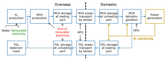 Figure 4 shows the supply chain for the use of MCH as an energy carrier, and Table 2 lists the specifications for each process (“Value” in Table 2, Table 3, Table 4 and Table 5 means the specific values assumed for the parameters of each process in the supply chains). Parameters listed in Table 2 were set by collecting data from literature surveys [30,37,38].