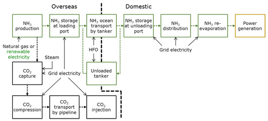 Figure 5 shows the NH3 supply chain, and Table 3 lists the specifications for each process. Parameters listed in Table 3 were set by collecting data from literature surveys [39,40,41].