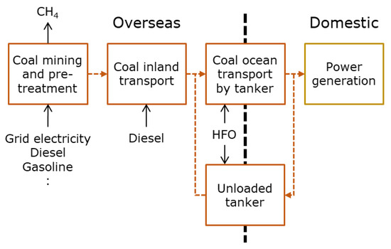 Figure 6 shows the coal supply chain, and Table 4 lists the specifications for each process. Coal mined overseas first undergoes pre-processing. Methane emissions from coal mines and CO2 emissions from consumables during mining (steel, explosives, etc.) were also considered. The coal is then transported by rail (fueled by diesel) to the port, where it is transported by coal carriers to power plants in Japan. For international transportation, CO2 emissions for the round trip between Japan and the coal-producing country were considered, and the fuel was assumed to be HFO.