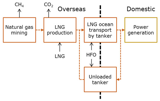Figure 7 shows the LNG supply chain, and Table 5 lists the specifications for each process. First, natural gas is extracted from overseas gas fields and liquefied. Consideration is also given to methane emissions from natural gas mining and CO2 emissions from crude gas during liquefaction. LNG is then transported by a tanker to a power plant in Japan. For international transportation, CO2 emissions for the round trip between Japan and the gas-producing country were considered, and the fuel was assumed to be boil-off gas and HFO.