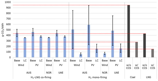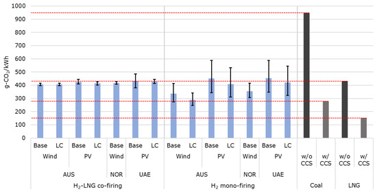 For the “base case” (denoted as Base in the figures) of this study, it was assumed that only the hydrogen production process uses renewable energy power generation, while the electricity input to the other overseas processes uses grid electricity. However, for countries such as AUS and the UAE, where the CO2 emission intensity of grid electricity is large, the emission from the entire supply chain can be decreased by substituting overseas processes with available renewable energy electricity into the grid electricity input. Therefore, in the analysis, it was also considered that for the hydrogen supply chain from AUS and the UAE, the electricity necessary to operate the overseas processes is from the same renewable energy sources as renewable hydrogen production—denoted the “low-carbon case” (LC) in the figures. It was also assumed that the electricity input into domestic processes was supplied by hydrogen power generation.