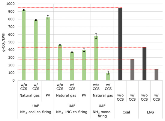 Figure 10 shows life-cycle CO2 emissions of NH3 power generation. The result for NH3–coal co-firing (at an NH3 co-firing rate of 20%) shows that the range of emission variation is lower than those from coal-fired power generation without CCS in all cases, indicating that NH3 co-firing is effective in reducing CO2 emissions from coal power plants. In contrast, when comparing NH3–LNG co-firing (at an NH3 co-firing rate of 20%) and LNG-fired power generation without CCS, the emissions from NH3–coal co-firing are lower if CCS is implemented, or when solar PV power is used in NH3 production process. This result indicates that environmental benefits of NH3 co-firing in LNG power plants can be gained when a low-carbon NH3 production process is selected.