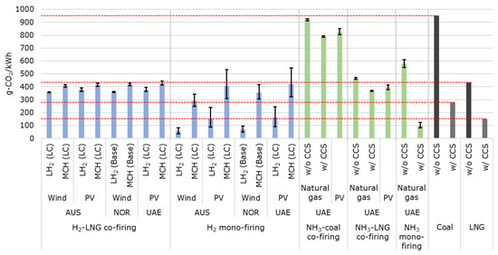 We conducted an LCI analysis of both hydrogen and NH3 power generation (co-firing and mono-firing), while considering the uncertainties, to identify and understand the factors that are important for realizing low-carbon generation using hydrogen energy in the electric power sector. Hydrogen was assumed to be produced from renewable energy sources in AUS, NOR, and the UAE and stored and transported using LH2 and MCH as carriers, while NH3 was assumed to be produced from renewable energy or natural gas in the UAE. Parameters related to the supply chain were collected from the literature, and the Japanese life-cycle inventory database IDEA was used to calculate emissions. The probability distributions of each parameter were established using the energy consumption and CO2 emissions of each process in the supply chain as variables, and the uncertainties of life-cycle CO2 emissions were calculated stochastically using Monte Carlo simulation. We compared the life-cycle CO2 emissions of hydrogen and NH3 power generation obtained from the Monte Carlo simulations with those of thermal power generation, as shown in Figure 8, Figure 9 and Figure 10. The bars represent the mean of the results, and the error bars represent the 99.7% confidence interval (corresponding to 3σ if a normal distribution is assumed). Probability distributions of the life-cycle CO2 emissions of hydrogen and NH3 power generation are also illustrated in Appendix B Figure A1, Figure A2, Figure A3, Figure A4, Figure A5, Figure A6 and Figure A7 (see Appendix B).
