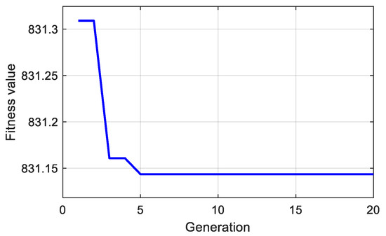 For example, if the vehicle speed is 10 km/h, and the FWSA is 3°, the changes in the generations and fitness values are shown in Figure 2. The fitness value is the required power of the vehicle (W). The figure indicates that the GA-PSO can quickly find the best torque distribution ratio, thereby reducing the required power of corners and improving the optimized speed effectively.
