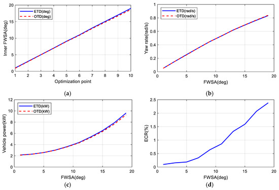 Taking the simulation situation of a vehicle speed of 30 km/h, for example, the changes of vehicle motion state and energy consumption with or without the OTD are shown in Figure 3a–d. Figure 3a illustrates that the inner FWSA difference gradually increases with the increase in steady-state FWSA with ETD. Figure 3b illustrates that the yaw rate is almost unchanged after OTD, indicating that the characteristics of curve conditions of the vehicle are the same, and the vehicle can maintain its driving stability. It can be seen from Figure 3c that with the increase in the FWSA, the difference of the required power of the vehicle also gradually increases after OTD. Figure 3d shows that, as the FWSA increases, the energy conservation ratio (ECR) also gradually increases.