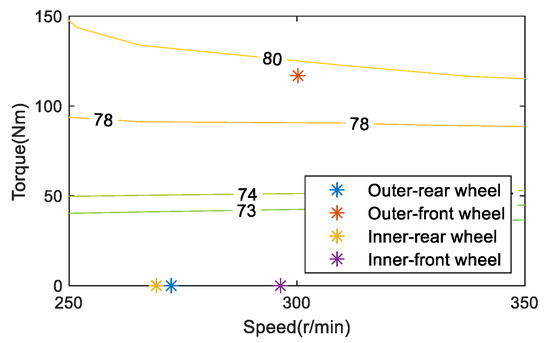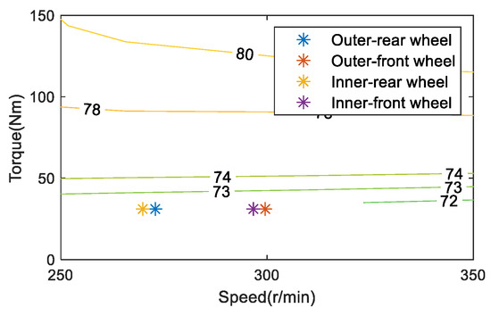 Taking a turning condition with a vehicle speed of 30 km/h and a front wheel angle of 11° as an example, the motor working point of ETD and OTD is shown in Figure 6 and Figure 7. Since the current total torque demand of the vehicle is not large, the efficiency of the motor working point of ETD is about 72%. When the vehicle is with OTD, on the one hand, it is hoped that the larger the driving torque difference between the outer wheels and the inner wheels, the better the energy-saving effect of the vehicle; on the other hand, the higher the efficiency of the motor operating point, the better the energy-saving effect of the vehicle. Considering the two factors comprehensively, increasing the torque of the outer wheel and the motor working point will move to a more efficient point. Reduce the torque of the inner wheel, and the motor operating point will move lower. Without considering other power losses of the motor, it is believed that the vehicle is only driven by the outer wheels, which has the best effect on weakening the turning resistance. At the same time, torque is distributed in the outer wheels of the front and rear axles. Since the total torque demand of the motor at this time is not large and is only driven by a single motor, the efficiency of the motor working point will be higher. Therefore, it is believed that the vehicle driven by a single outer wheel has the highest contribution to energy saving, considering the influence of the TVD control and the motor working point. In combination with Table 3, as the total required torque of the vehicle is not large, to improve the energy-saving contribution of the TVD control to the vehicle’s curve conditions, most of its driving mode is single outer-wheel drive. This feature is conspicuous in the low-to-medium speed and small turning radius conditions.