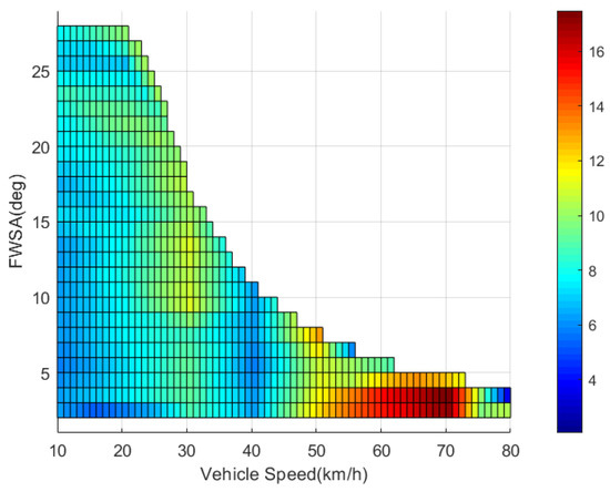 Using the GA-PSO described earlier in this article, we optimize respectively for the simulation conditions of vehicle speed at 10 km/h–80 km/h and front wheel angles of 1°–29° and finally get the TDC as shown in Table 3.
