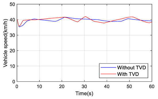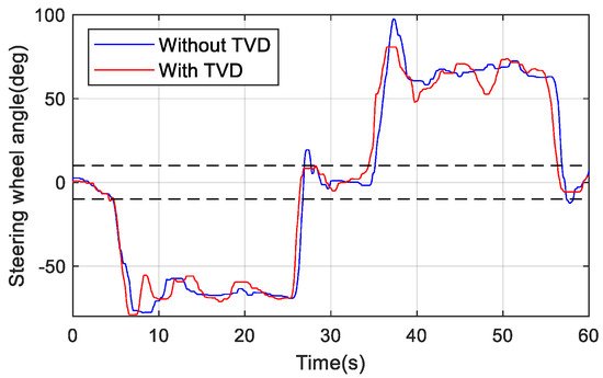 The change of steering wheel angle during the test is shown in Figure 1. To avoid the frequent adjustment of torque by TVD control, which affects the driver’s driving experience, the adjustment range of steering wheel angle is −10°–10°, where TVD does not work. Figure 11 illustrates that the steering angle of the steering wheel with TVD control is slightly smaller. The change of the yaw rate is shown in Figure 12. It can be seen that there is a slight deviation of the yaw rate with TVD control due to the driver’s operating. However, we also know that the yaw rate remains basically unchanged and is always able to maintain the driving stability of the vehicle.